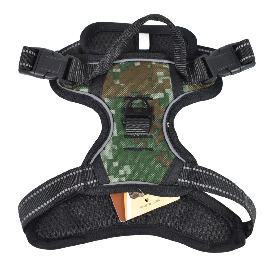 Arnés ajustable para mascotas.Talle: L.Circunferencia del cuello: 46-66 cm.Contorno de pecho: 43-86 cm.Color: verde camuflado.Tiras reflectantes.Asa de seguridad superior.Cuenta con 4 correas ajustables para lograr un ajuste perfecto en su crecimiento.Hecho de poliéster con interior acolchonado.