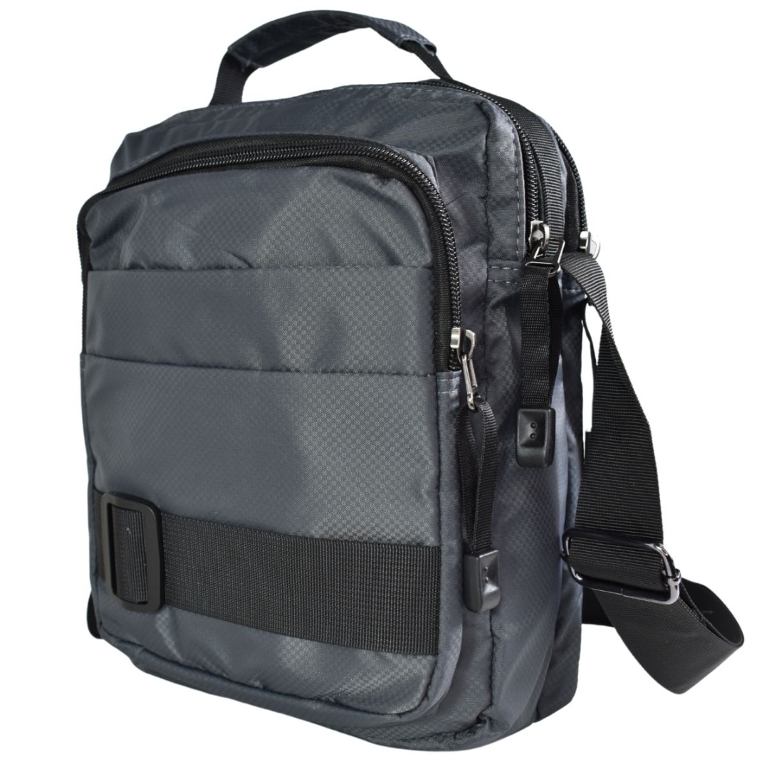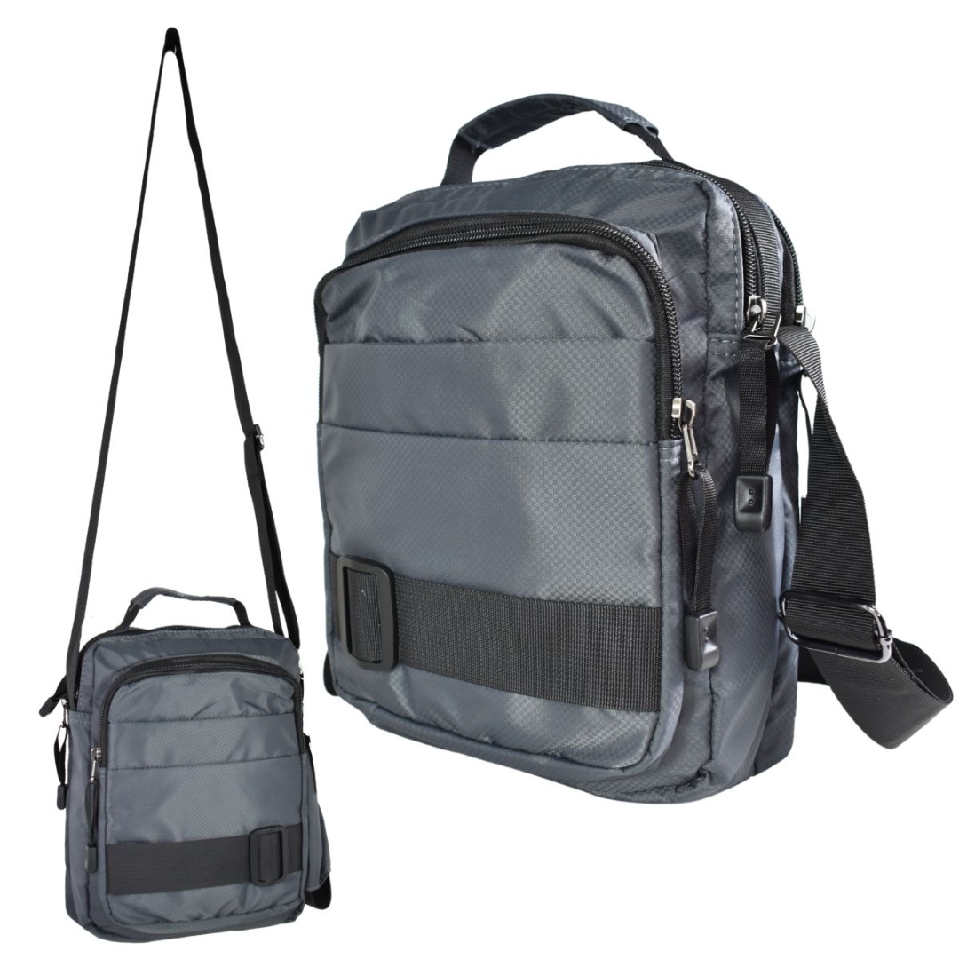 Bolso al hombro.Medidas: 25x20x10xm.Color: gris. Correa larga ajustable.4 bolsillos con cierre, 1 bolsillo interno con cierre, bolsillo lateral para botella y bolsillo delantero sin cierre.Paredes acolchonadas para transportar dispositivos.Material: nailon.Impermeable.