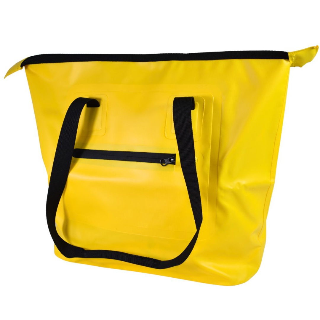 Bolso impermeable de PVC para playa.Medidas: 42x32cm.Color: Amarillo.Con cierre y asas para cargar.Bolsillos internos de malla de red que brindan espacio organizado para sus artículos imprescindibles para la playa, como protector solar, botellas de agua, llaves y teléfonos móviles.