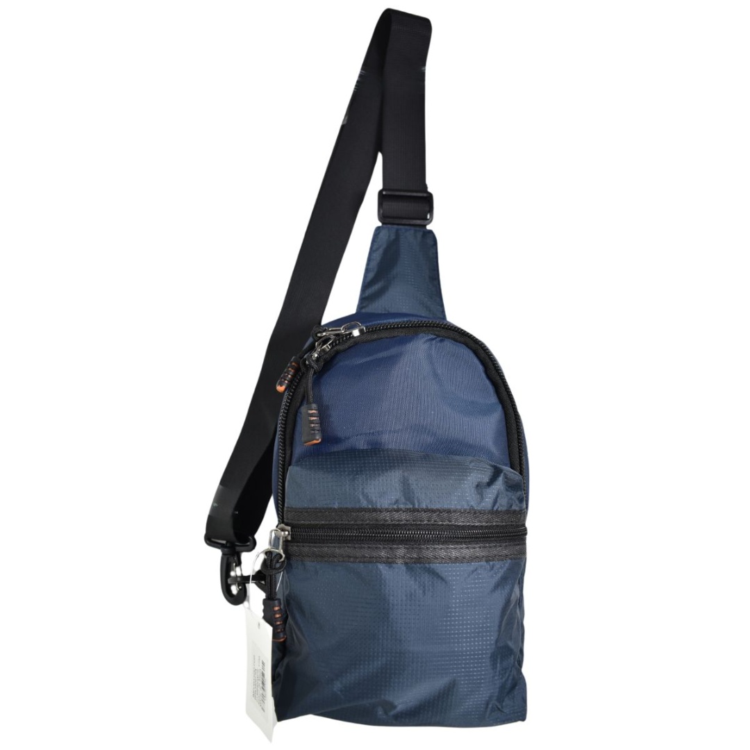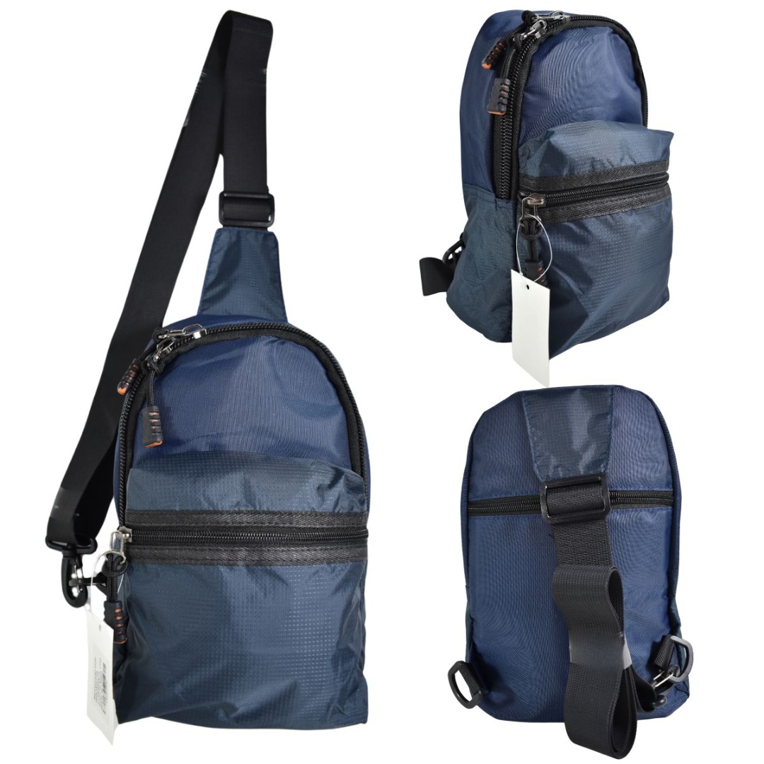 Bolso morral azul.Medidas: 28x18x8cm.Material: nailon.3 bolsillos con cierre.Correa ajustable, con gancho para cambiar la posición de izquierda a derecha.
