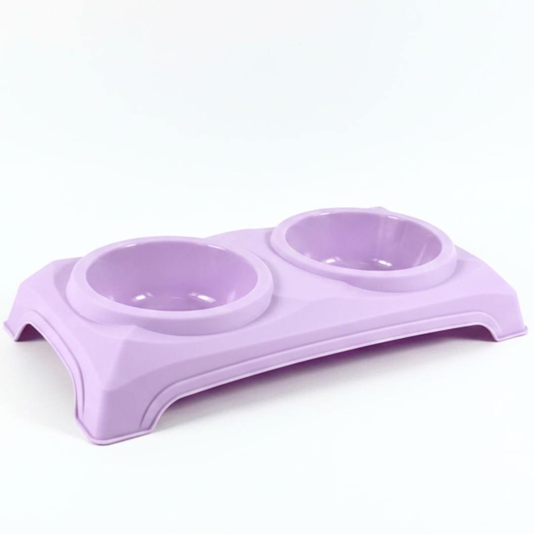 Comedero bebedero doble para mascotas.Medidas: 34x17x8cm.Color: lila. Material: plástico.