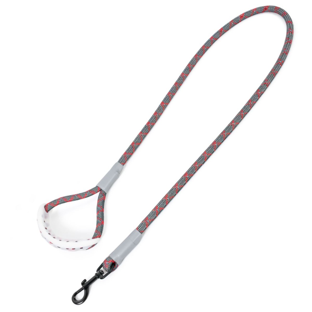 Correa roja y gris para mascotas.Largo: 120cm.Ancho: 0.6cm.Material: cuerda con asa de silicona ergonómica.