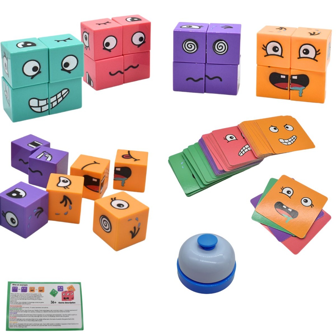 Cubos de expresiones faciales intercambiables.Presentación: caja.Medidas aproximadas del empaque: 19x11cm.Contenido del juego: 16 cubos (4 cubos de cada color); 72 cartas que representan diversas expresiones faciales; 1 campana para añadir dinamismo al juego e instrucciones ilustradas para facilitar el entendimiento del juego.