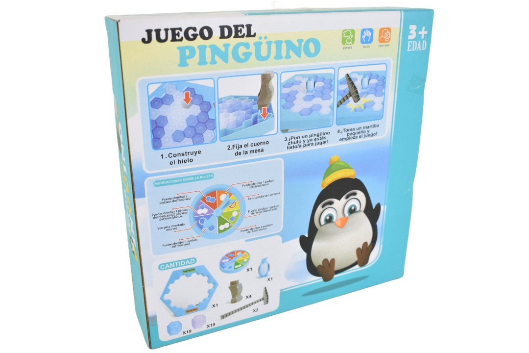 Juego de mesa pingüino.Incluye: tablero, hielo, 1 pingüino, ruleta, 2 martillos.Instrucciones: *Construye el tablero con hielos.*Fijá las patas de la mesa.*Coloca el pingüino.*Tomá el martillo y ¡empieza el juego!Para 2 a 4 jugadores.Medidas aproximadas del empaque: 25 x 25 x 6 cm.Recomendado para niños mayores de 3 años.