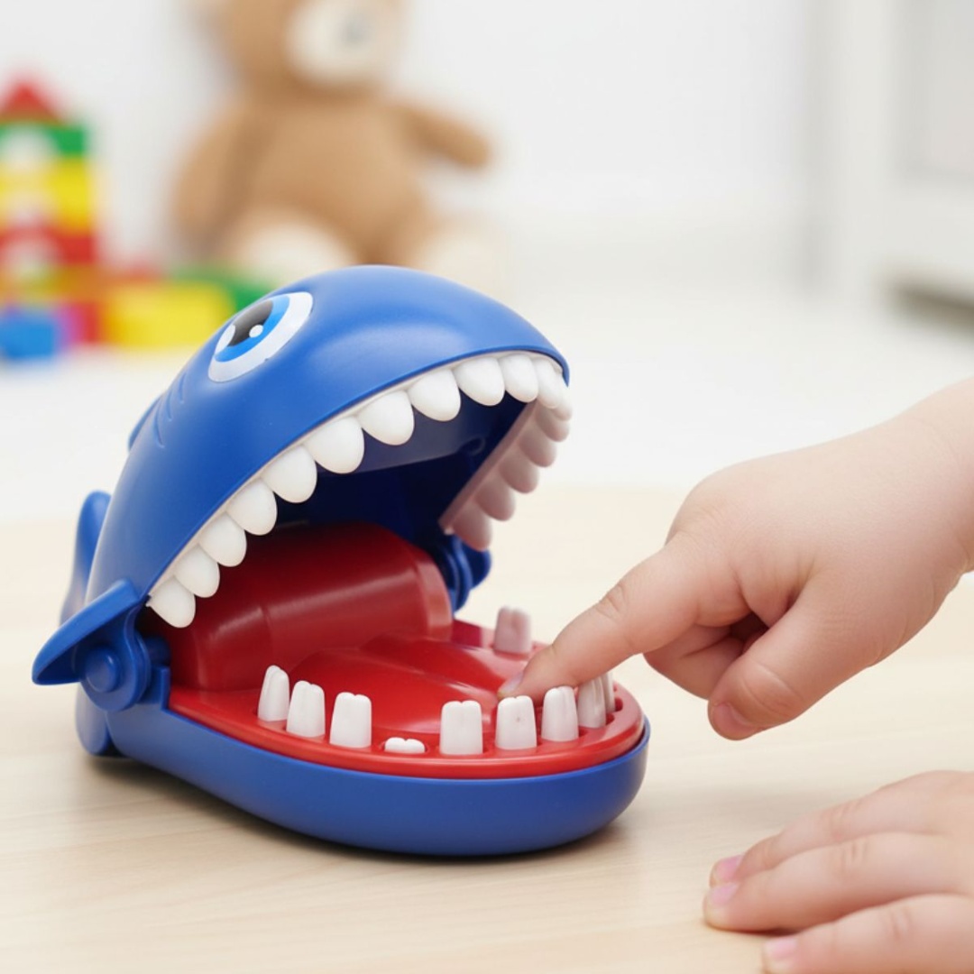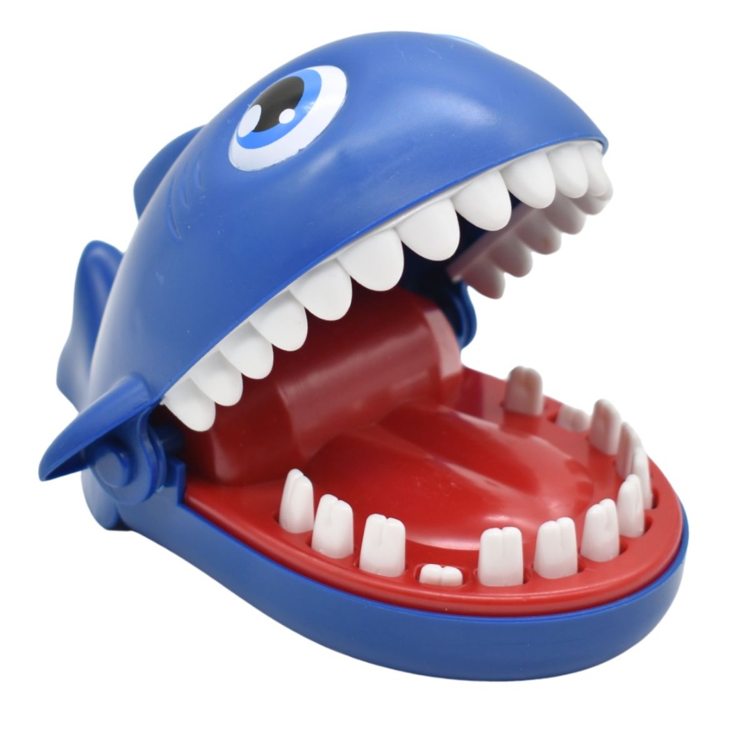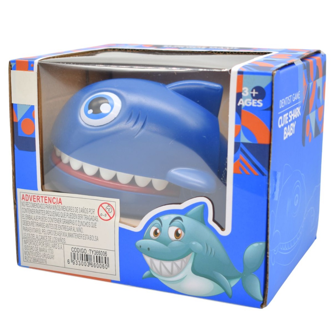 Juego tiburón mordedor.Medidas aproximadas del producto: 16 x 12 cm.Instrucciones:1 Abrirle la boca.2 Prueba tu suerte tocandole un diente.Color: azul.En caja.