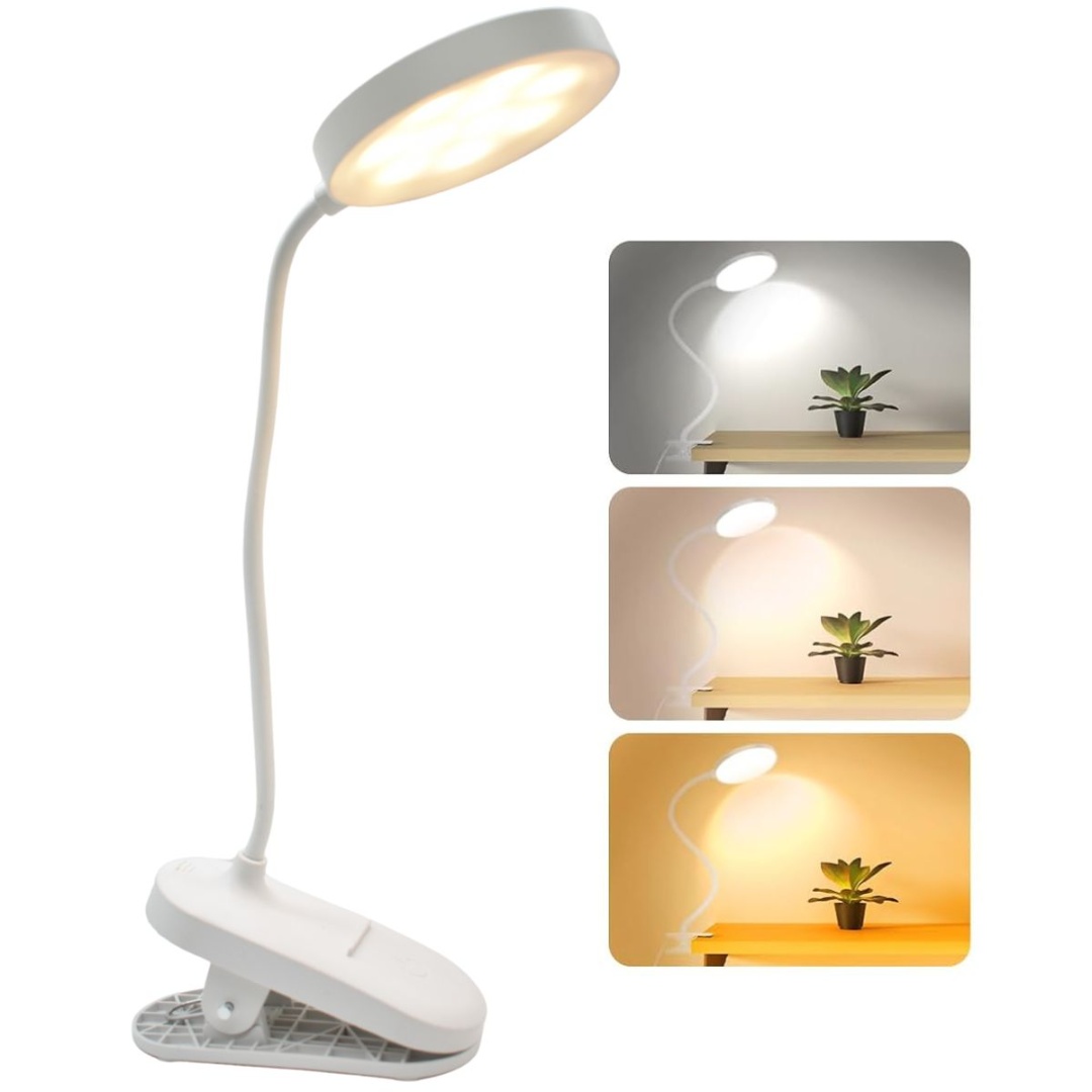 Lámpara de escritorio con clip .Altura max.: 37cm.Medidas del clip: 11x5cm.Color: blanco.Temperatura de color: 3500K-6500K.Luz fría, cálida y neutra.Incluye cable USB de carga.Manguera flexible para direccionar la luz. Material: Plástico.En caja.