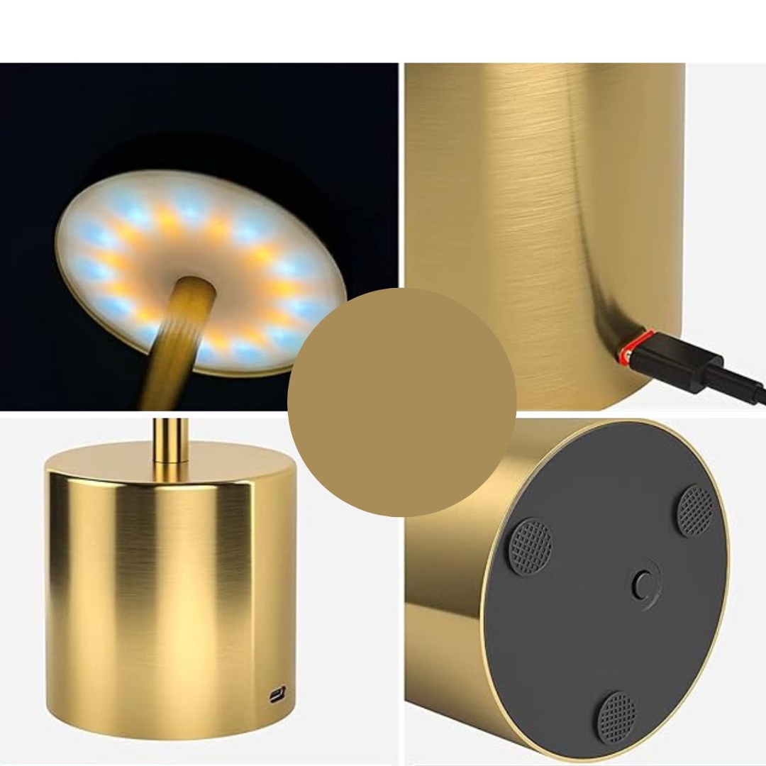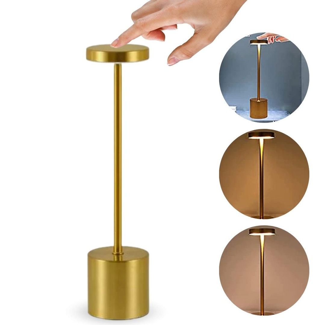 Lámpara de escritorio recargable digital.Medidas: 34x8cm.Incluye cable USB de carga. Color: dorado. Lámpara táctil de 3 temperaturas de color: las lámparas de escritorio inalámbricas están disponibles para encender/apagar y cambiar los modos de iluminación de 3 colores tocando el botón en la parte superior de la lámpara inalámbrica LED. Toque para cambiar las temperaturas de color de 3 de la iluminación: 2700K blanco cálido, 4000K blanco natural, 5000K luz blanca diurna.Si mantiene presionado el dedo en la parte superior puede subir o bajar la intensidad de la luz.