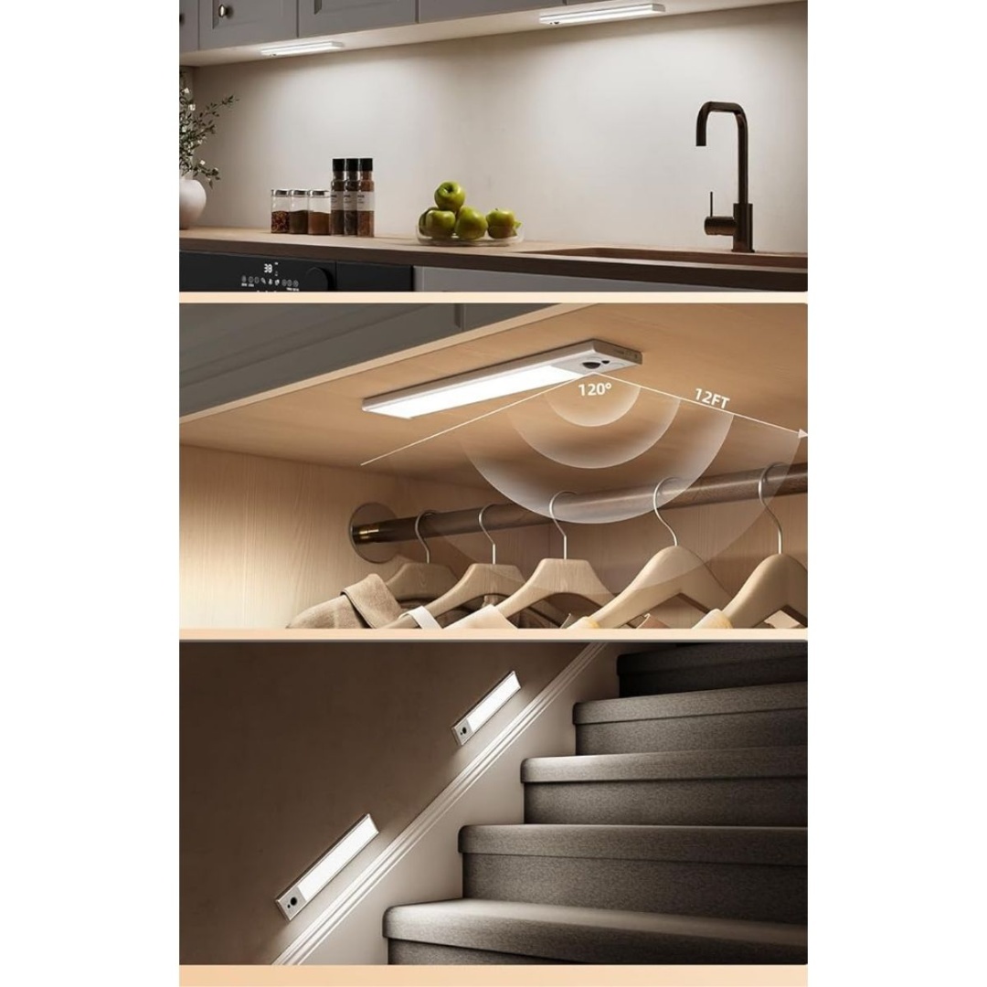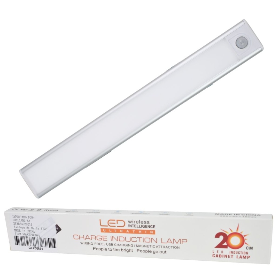 Lámpara led inalámbrica recargable.Medidas: 20x4cm.Modo de iluminación: luz cálida, fría, neutra.Tiempo de carga: 3-5hs.Material: aluminio.Diseñada para iluminación de gabinetes, armarios, bajo mesada, etc.Funcionamiento: Incorpora un sensor de movimiento humano infrarrojo pasivo (PIR) que enciende la luz automáticamente cuando detecta movimiento en un rango de hasta 3-5 metros y un ángulo de 120°. Se apaga automáticamente después de aproximadamente 20 segundos sin actividad.Instalación: Es inalámbrica y utiliza imanes y una tira adhesiva para fijarse a superficies, lo que permite quitarla fácilmente para recargarla.En caja.
