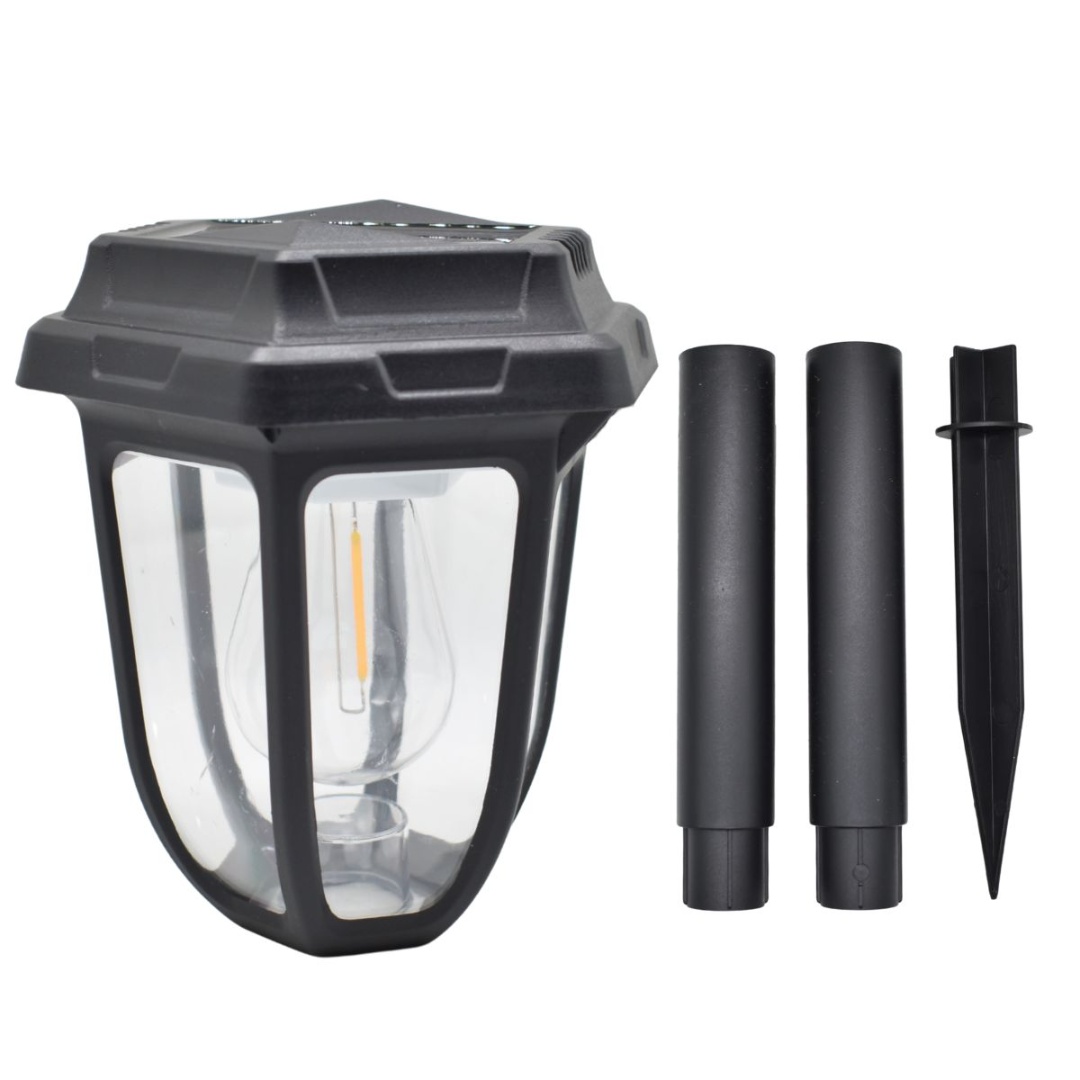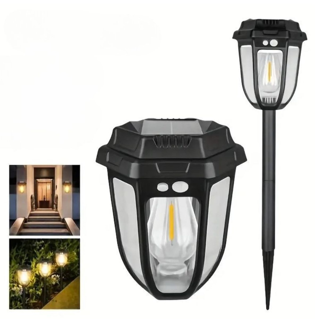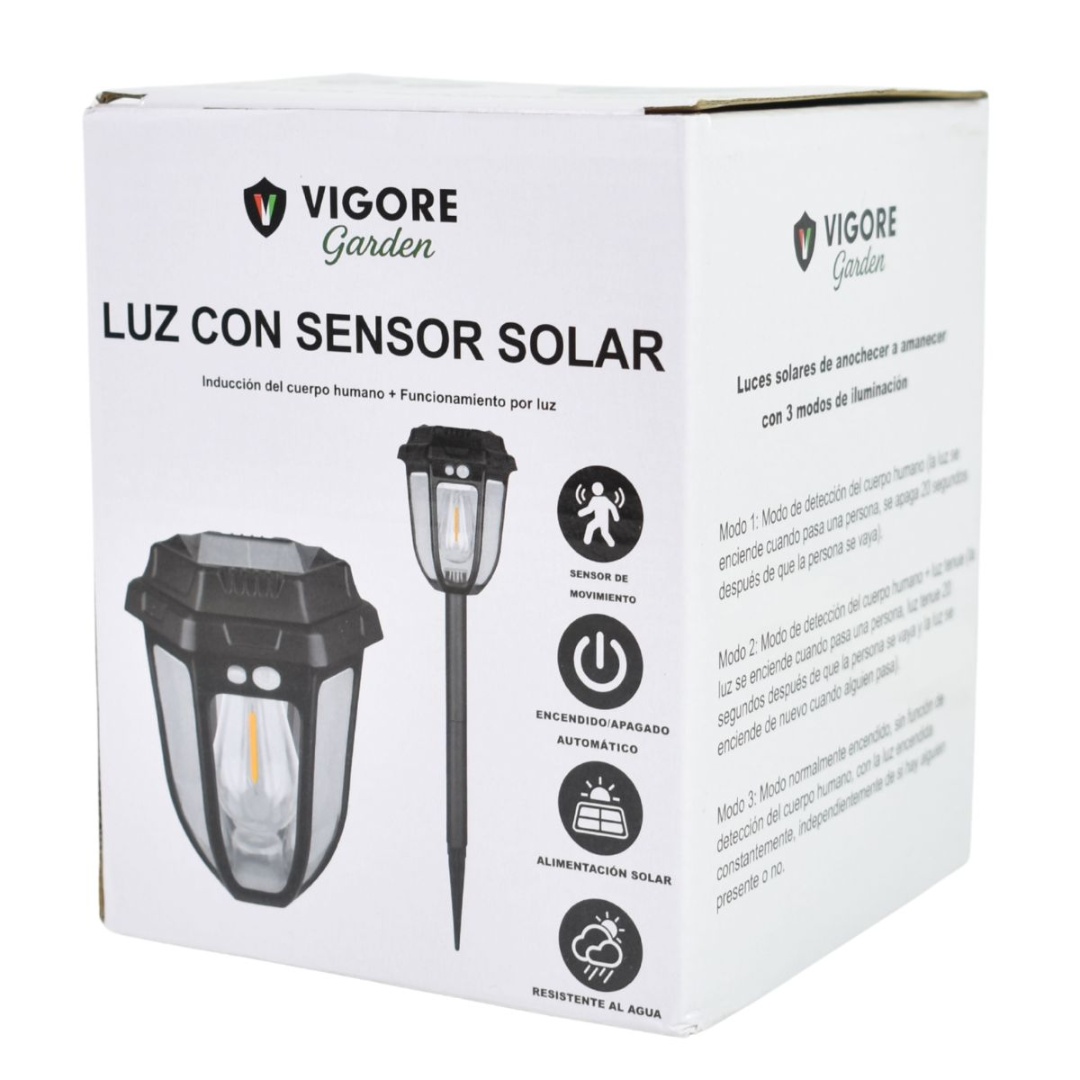 Lámpara solar para jardín.Medidas la lámpara: 15x12cm.Altura: 50cm.Distancia de inducción: 5-8 mts.Salida: 5V 2W.Marca: Vigore. Se enciende automaticamente al oscurecer. Carga solar y sensor de movimiento. Luz cálida.Material: plástico.Capacidad de la batería: 1200mAh.