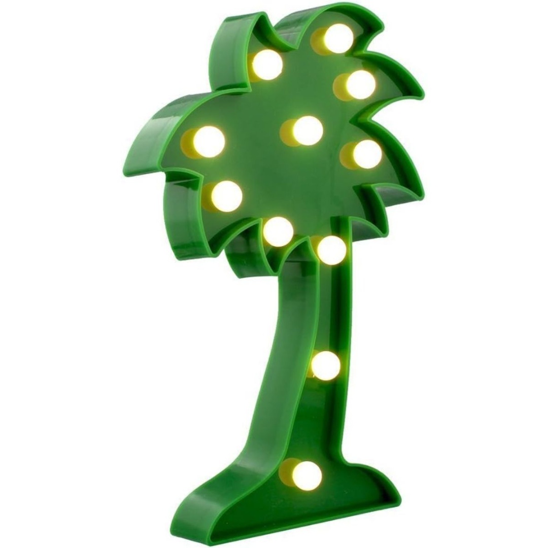 Lámpara LED con forma de palmera.Material: plásticoColor: verde.Medidas: 25x15x3cm.Funcionamiento: 2 pilas AA (no incluidas).Luz cálida.