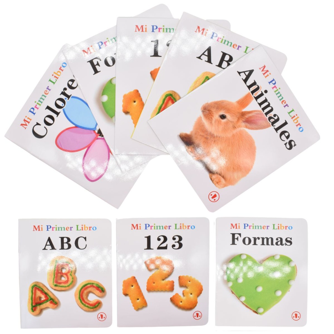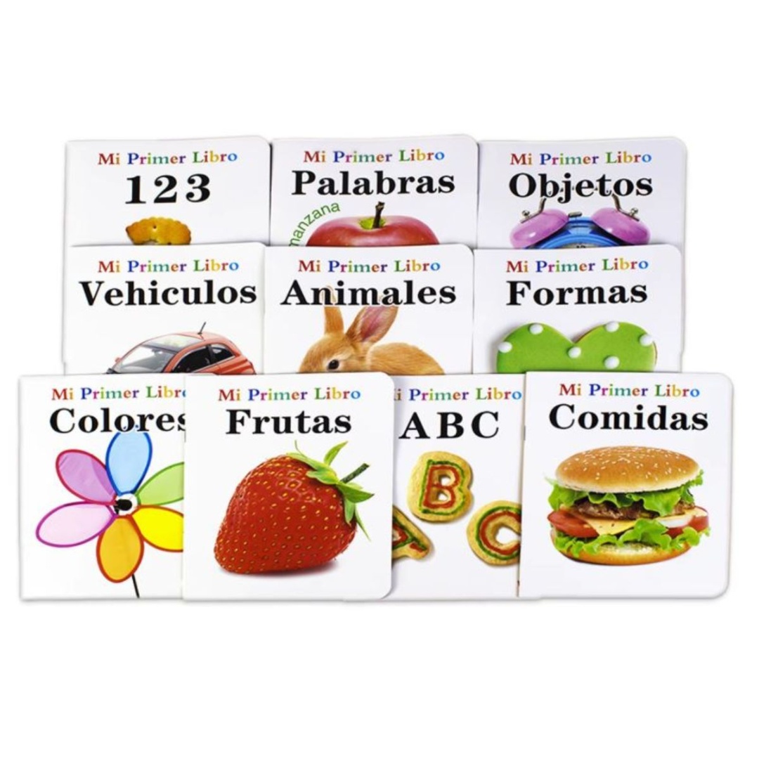 Libro de aprendizaje de palabras.Medidas: 14x17cm.En cada libro los niños relacionan la imagén con el nombre en español.10 diseños: libros sobre el abecedario, los números, los animales, los alimentos, los colores, los objetos, los vehículos, las formas, las palabras y las frutas.