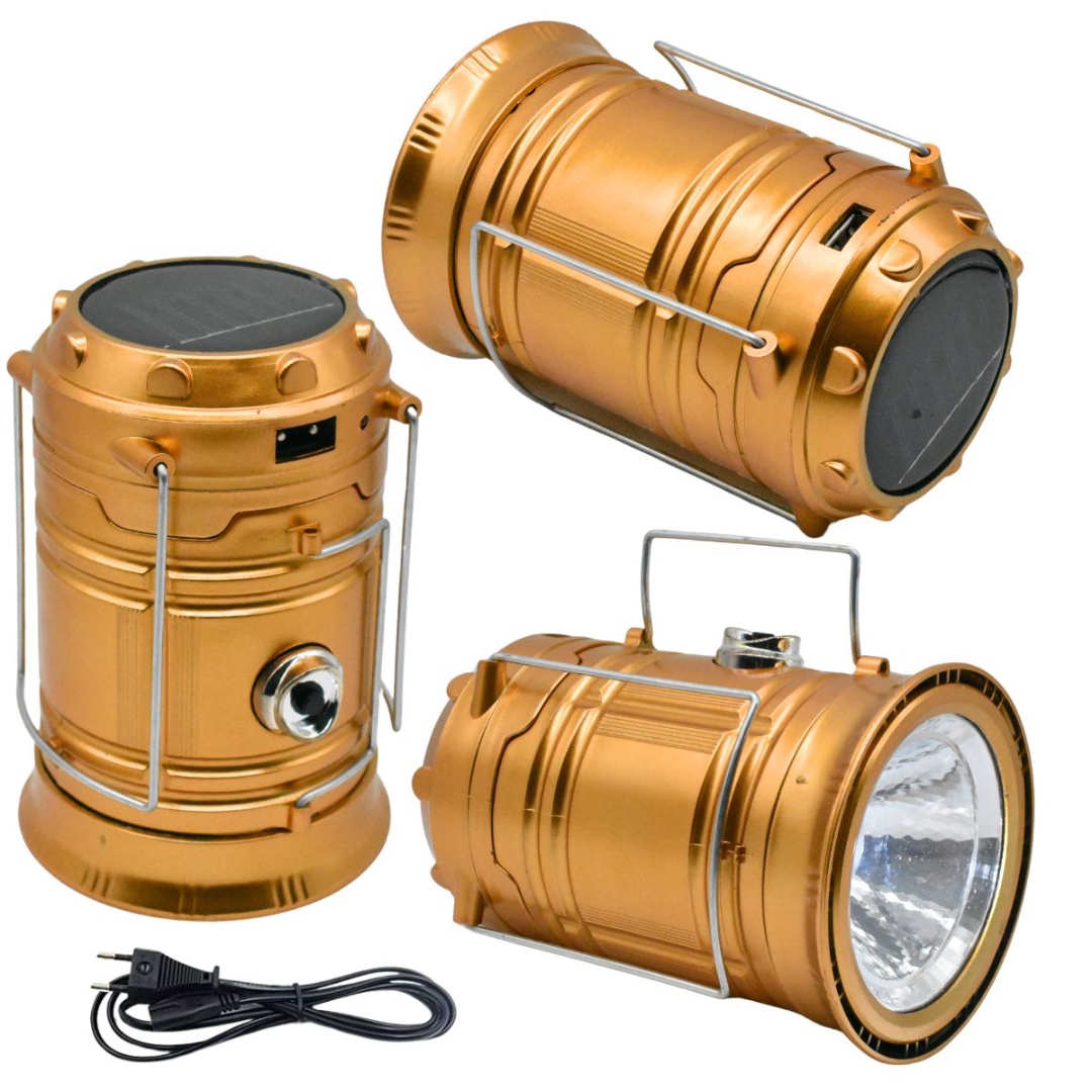 Linterna farol Luz LED.Material del producto: ABS + material de policarbonato.Tiempo de carga: 3-4 horas.Horas de trabajo: 6-8 horas.300 Lumen.Batería de Litio.220 V.Carga solar. Banco de energía de emergencia puerto USB.Plegable y compacto.Cobertura de iluminación 360º.2 Métodos de carga Solar y USB.Multiusos.Medida: 19×19.2×9.3cm, no estirado: 13.5 cm.Color: dorado.
