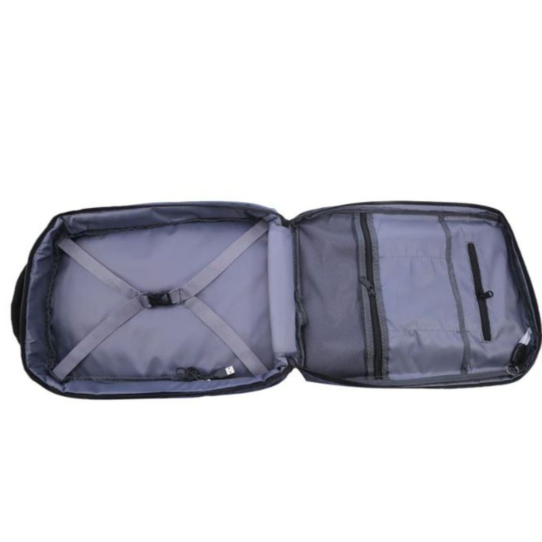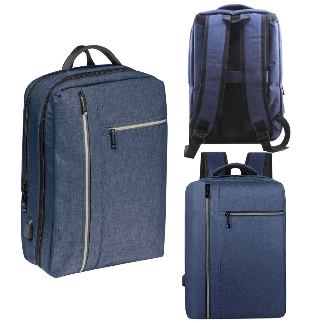 Mochila multifunción con puerto USB.Tela oxford impermeable y resistente al desgaste.Medidas: 42x30x15cm.Bolsillo interior con ranura, bolsillo para el celular, bolsillo interior con cremallera, compartimento interior, compartimento para laptop. Material del revestimiento: Poliéster.Color: azul. *NO INCLUYE POWER BANK*.