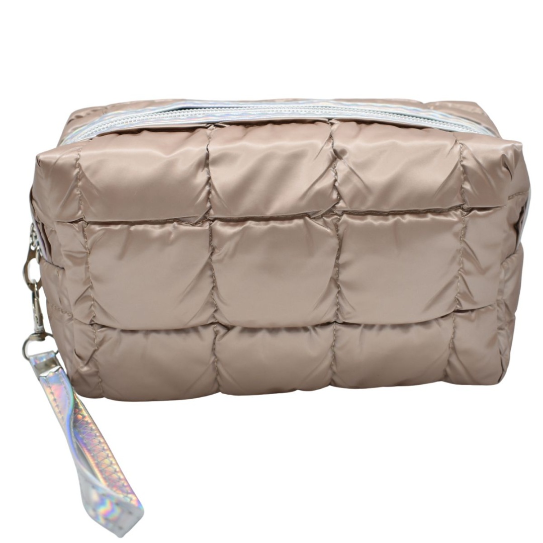 Neceser capitoneado de nailon marrón.Medidas: 20x10x6cm.Multiusos: estuche, porta cosméticos, cartuchera.