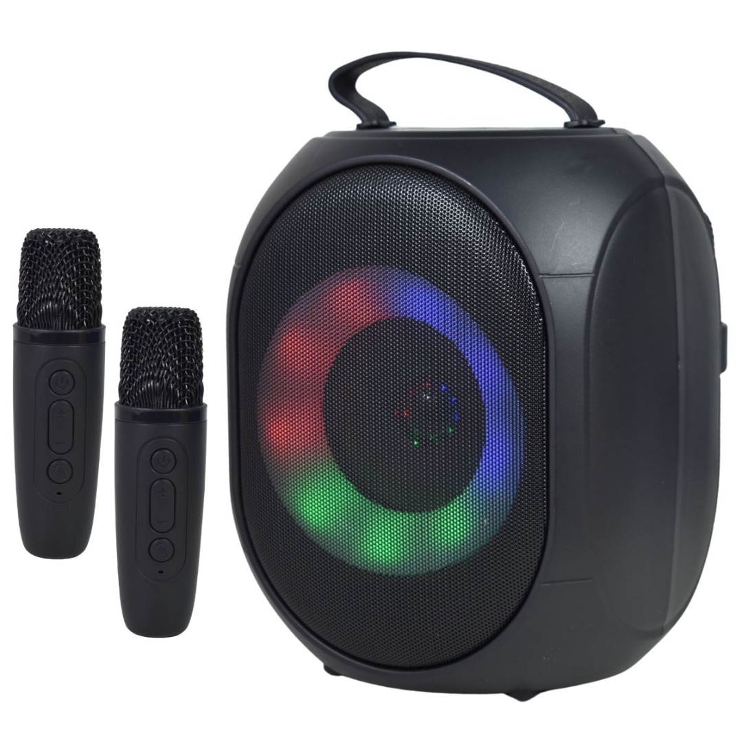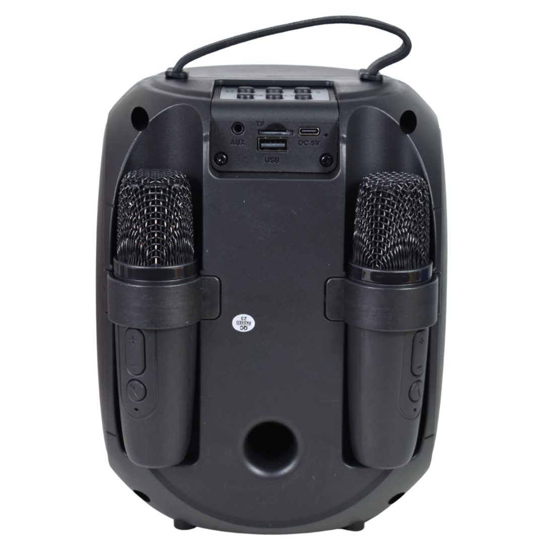 Parlante Bluetooth con micrófonos y luces.Entradas: USB, TF, DC 5V, AUX.Inalámbrico recargable.Luces RGB.Color: negro. Modo: BT, tarjeta de memoria (TF), FM.Incluye cable USB de carga.Capacidad de la batería: 1800mAh.Voltaje: DC 5V.Medidas del parlante: 22x17x16.8cm.Medidas de la caja: 22.5×17.5x17cm.Incluye 2 microfonos inalámbricos recargables. Peso: 0.650kgEn caja.