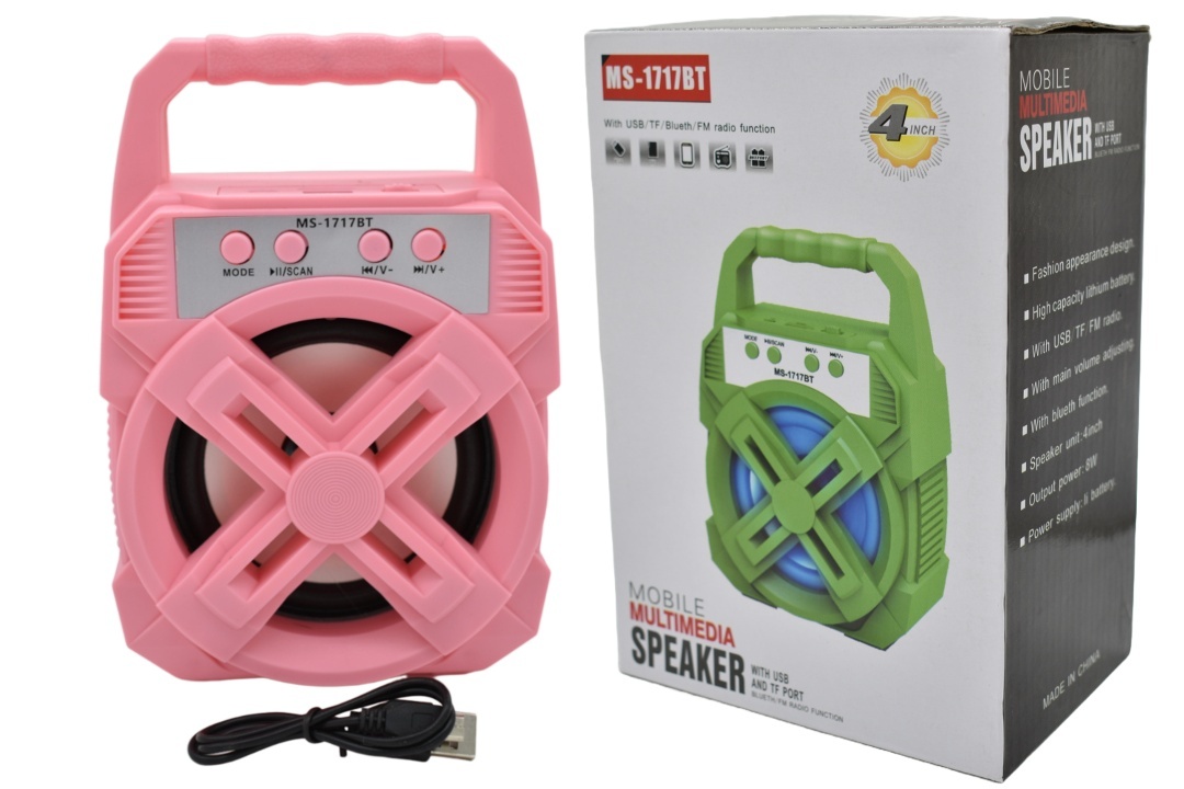 Disfruta de hasta **2 a 3 horas de reproducción continua** con una sola carga, ideal para largas jornadas de entretenimiento. Este parlante no solo destaca por su funcionalidad, sino también por su estética. Su llamativo color rosado lo convierte en un accesorio moderno y lleno de personalidad. El modelo MS-1717BT es la combinación perfecta de rendimiento, portabilidad y diseño. ¡Hazte con él y eleva tu experiencia musical!