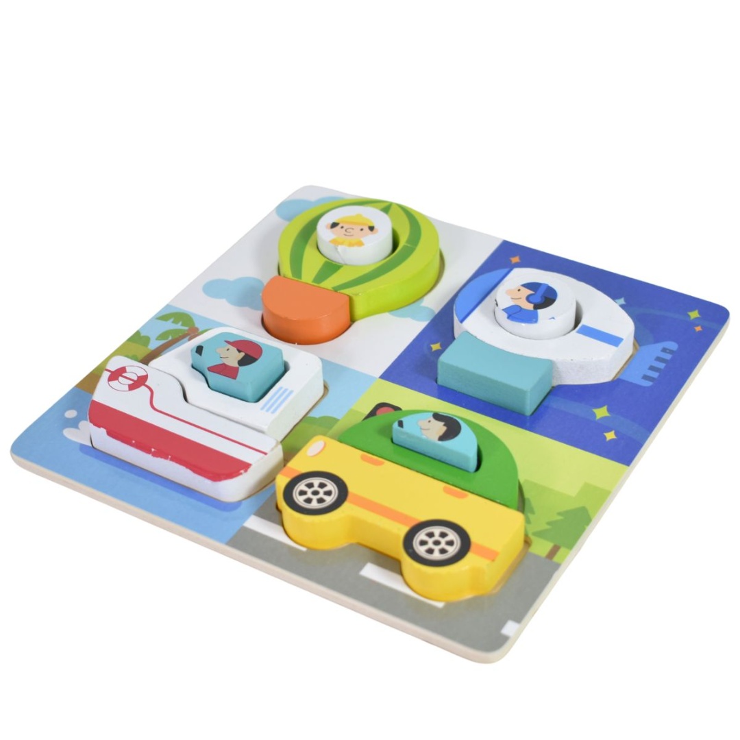 Puzzle 3D de madera con formas de vehículos.Medidas: 18x18cm.Ayuda al desarrollo cognitivo y a la motricidad fina mediante el juego. Incluye piezas de vehículos de rescate como una ambulancia, un camión de bomberos y un coche de policía.Las piezas son gruesas, lo que facilita que las manos pequeñas lo manipulen.